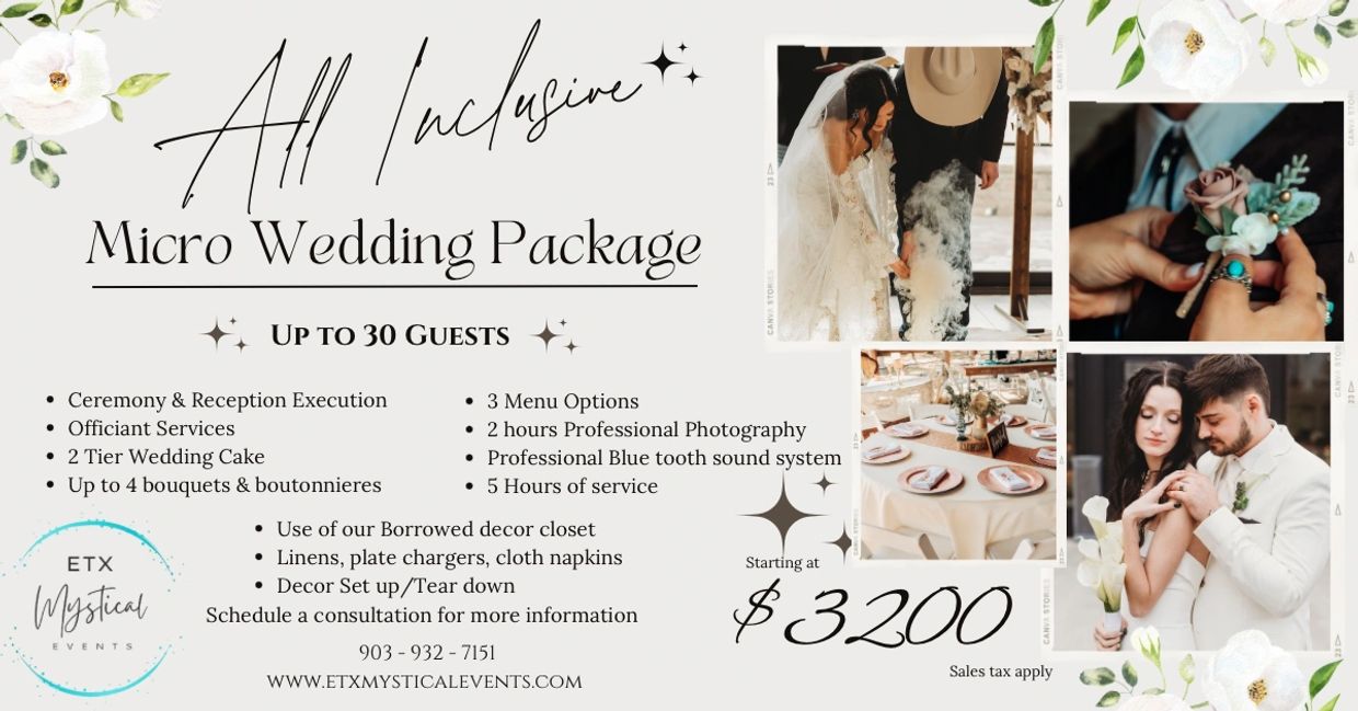 This package is designed for couples who want a more intimate experience with 30 guests or less. Planning your dream wedding can be overwhelming, but it doesn’t have to be!